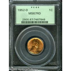 <B>1952-D 1C MS67 Red PCGS.</B></I> Even fiery-red mint luster characterizes this modern business strike. Population: 44 in 67, 0 finer (1/05). Lot:5560