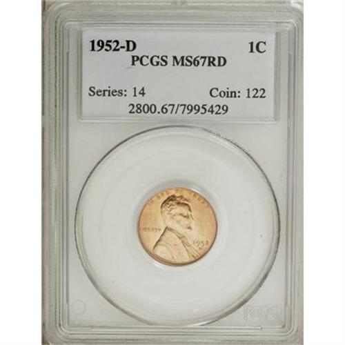 <B>1952-D 1C MS67 Red PCGS.</B></I> A shimmering, well struck copper-orange example that shows occasional straw accents in the fields. This magnificently preserved piece is tied for the finest Red representative graded by either NGC or PCGS (12/07).<BR><BR><B>Coin Engraver:</B> Victor D. Brenner<BR><BR><b>Shipping:</b> Coins & Currency (<a target="_blank" href="http://www.heritageauctions.com/common/shipping.php">view shipping information</a>)