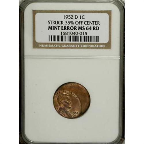 <B>1952-D 1C Lincoln Cent--Struck 35% Off Center--MS64 Red NGC.</B></I><BR><BR><B>Coin Engraver:</B> Victor D. Brenner<BR><BR><b>Shipping:</b> Coins & Currency (<a target="_blank" href="http://www.heritageauctions.com/common/shipping.php">view shipping information</a>)