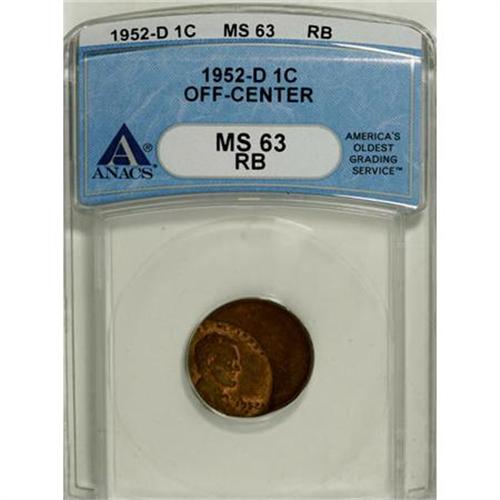 <B>1952-D 1C Cent--Off Center--MS63 Red and Brown ANACS.</B></I> <BR><BR><B>Coin Engraver:</B> Victor D. Brenner<BR><BR><b>Shipping:</b> Coins & Currency (<a target="_blank" href="http://www.heritageauctions.com/common/shipping.php">view shipping information</a>)