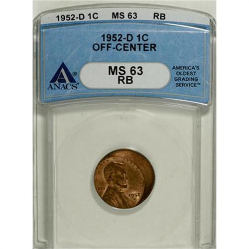 <B>1952-D 1C Cent--Off Center--MS63 Red and Brown ANACS.</B></I> <BR><BR><B>Coin Engraver:</B> Victor D. Brenner<BR><BR><b>Shipping:</b> Coins & Currency (<a target="_blank" href="http://www.heritageauctions.com/common/shipping.php">view shipping information</a>)