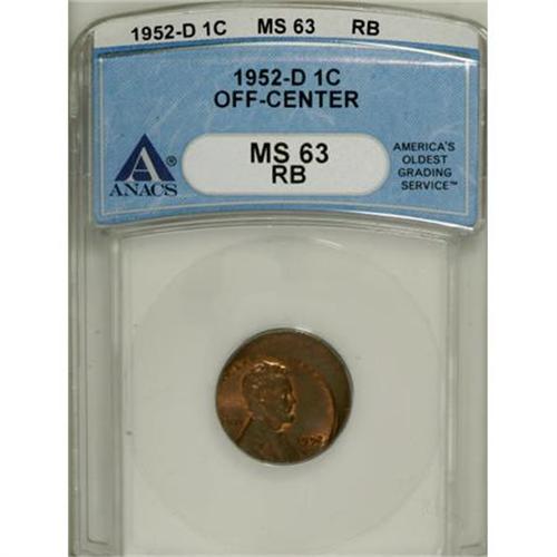 <B>1952-D 1C Cent--Off Center--MS63 Red and Brown ANACS.</B></I> <BR><BR><B>Coin Engraver:</B> Victor D. Brenner<BR><BR><b>Shipping:</b> Coins & Currency (<a target="_blank" href="http://www.heritageauctions.com/common/shipping.php">view shipping information</a>)