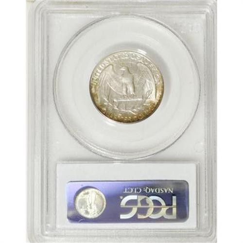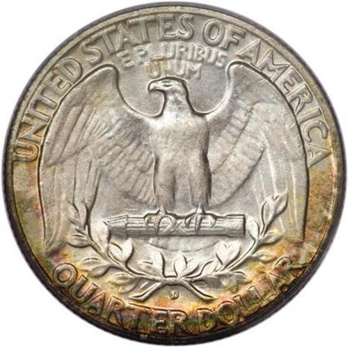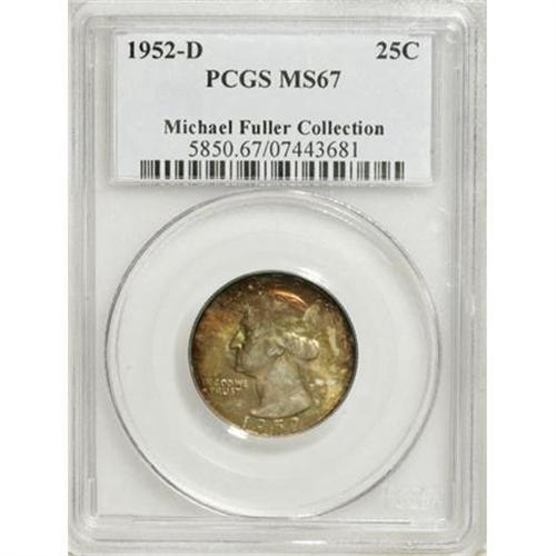 <B>1952-D 25C MS67 PCGS.</B></I> An outstanding Superb Gem, and one of just eight tied for the finest certified by PCGS (10/07). The prime draw of this wonderful D-mint piece is its spectacular obverse patina, mustard-gold and dusky peach with occasional jade accents. The reverse is pleasingly lustrous and silver-white in the centers with delicate canary-yellow and pumpkin-orange at the margins.<BR><I>From The Michael Fuller Collection.</B></I><BR><BR><B>Coin Engraver:</B> John Flanagan<BR><BR><b>Shipping:</b> Coins & Currency (<a target="_blank" href="http://www.heritageauctions.com/common/shipping.php">view shipping information</a>)