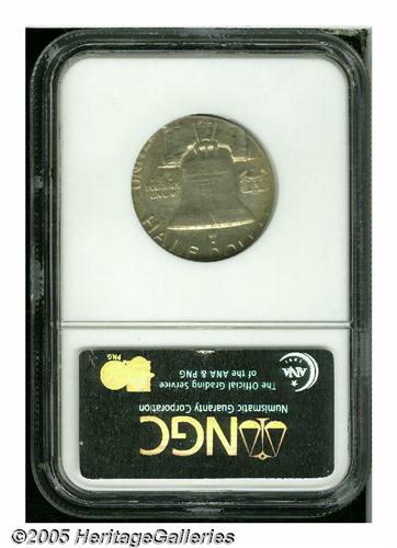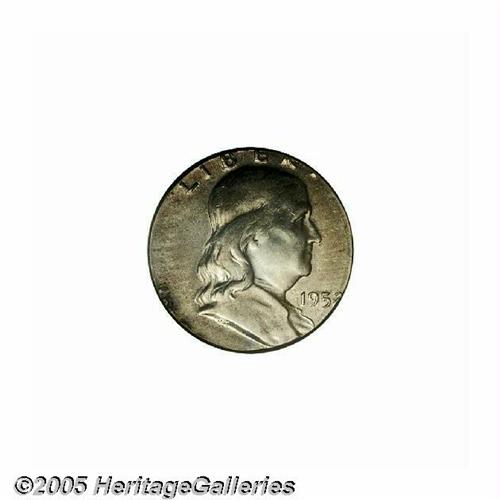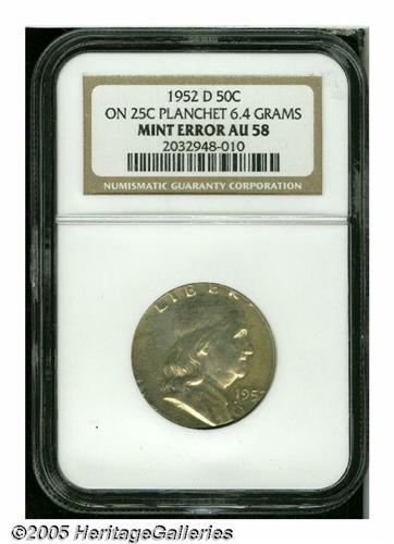 <B>1952-D<50C> Franklin Half Dollar--Struck on a Quarter Planchet--AU58 NGC.</B></I> 6.4 grams. An off center striking with a full rim on the left portion of the obverse and reverse. Excellent mint luster is seen throughout, and there is a slight overlay of toning on each side.