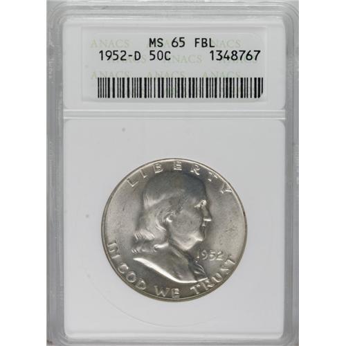 <B>1952-D 50C MS65 Full Bell Lines ANACS.</B></I> NGC Census: (199/11). PCGS Population (532/49). Numismedia Wsl. Price: $220. (#86662)<BR><BR><b>Shipping:</b> Coin/Currency (<a target="_blank" href="http://www.heritageauctions.com/common/shipping.php">view shipping information</a>)