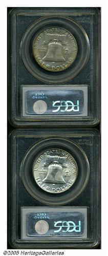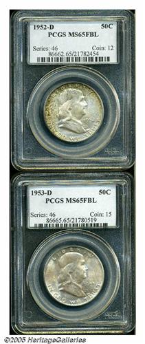 <B>1952-D<50C> MS65 Full Bell Lines PCGS,</B></I> golden-russet patina encroaches upon the steel-blue centers; and a <B>1953-D MS65 Full Bell Lines PCGS,</B></I> dusky silver-gray and chestnut colors enrich the obverse, the reverse is brilliant.
