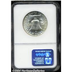<B>1952-D<50C> MS65 NGC.</B></I> Showing seemingly pristine fields, the lower portion of the reverse bell holds several grade limiting marks. Enhancing the eye appeal, a slight mustard-yellow coloration is seen gracing the flashy surfaces of portions of both sides. <BR><BR><B>Important notice:</B> Heritage usually auctions material at the rate of 200-250 lots per hour. On some occasions eBay Live bid software or the Internet may not be able to keep up with the pace of the auction. We recommend placing a realistic absentee bid now as insurance to avoid disappointment. Occasionally the auctioneer may eliminate or reject an eBay Live bid, and the auctioneer may also reopen a lot after the close of the eBay live bidding (usually because we missed an audience bid), and may reject your bid even if it shows you as the winning bidder. By bidding via eBay Live, you agree that Heritage may award the lot to another bidder at its sole discretion under the circumstances described above or any other reasonable circumstances. Since eBay bids are not shown to us until we open the lot on the floor, we treat those bids just like floor bids. In most cases the floor responds before the eBay bid is presented to us, due to Internet lag time, so for consistency we have made it a policy that floor bids are always considered first over tie eBay live bids. Also please note that all Heritage lots purchased through eBay Live carry a 20% Buyer's Premium. Please make sure you read the Terms and Conditions before you bid. </span></font></tr></table></td></tr></table>