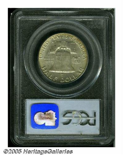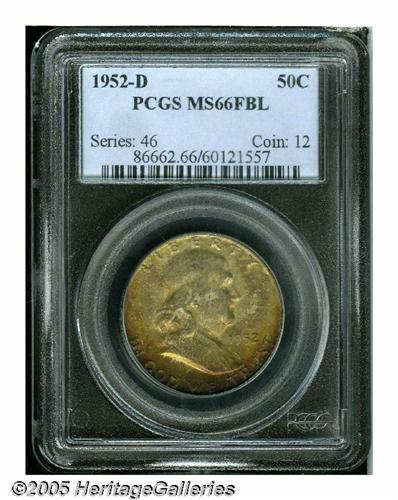 <B>1952-D<50C> MS66 Full Bell Lines PCGS.</B></I> Lustrous surfaces are blanketed by a melange of medium intensity gold, sea-green, crimson, orange, and magenta on the obverse, while the reverse displays a thin veneer of ice-blue accented by peripheral gold-brown. Nicely struck throughout, with some of the bell lettering showing, in addition to the full bell lines. The surfaces are devoid of significant marks. Population: 46 in 66, 1 finer (5/05).