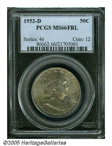 <B>1952-D<50C> MS66 Full Bell Lines PCGS.</B></I> Nicely struck with lustrous surfaces cloaked in medium intensity, multicolored toning. A few inconsequential marks are noted on Franklin's cheek. Population: 44 in 66, 1 finer (5/05).