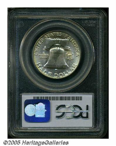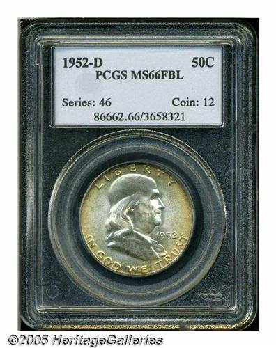 <B>1952-D<50C> MS66 Full Bell Lines PCGS.</B></I> Silver-gray surfaces are accented by rich golden-brown toning at the obverse rim, the reverse is much lighter. A few small scattered ticks, including one on the Liberty bell, do not distract.<BR><I>From The Western Hills Collection.</B></I>