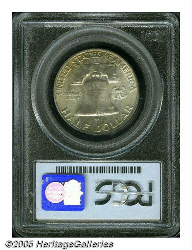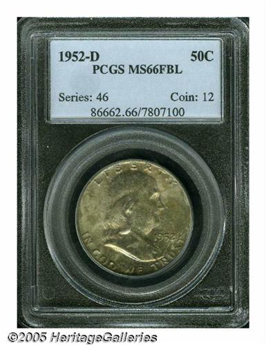 <B>1952-D<50C> MS66 Full Bell Lines PCGS.</B></I> Well struck and highly lustrous, with uneven multicolored earth tones on the obverse, along with bright pink and lime-green accents in the lower field areas, and lighter toning on the reverse. Carefully preserved with a few minor marks. Population: 44 in 66 Full Bell Lines, 1 finer (5/05).