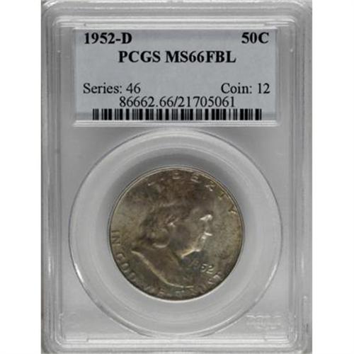 <B>1952-D 50C MS66 Full Bell Lines PCGS.</B></I> Nicely struck with lustrous surfaces cloaked in multicolored toning of medium intensity. Boldly detailed with pleasing luster. Population: 49 in 66, 1 finer (6/07).<BR><BR><b>Shipping:</b> Coins & Currency (<a target="_blank" href="http://www.heritageauctions.com/common/shipping.php">view shipping information</a>)