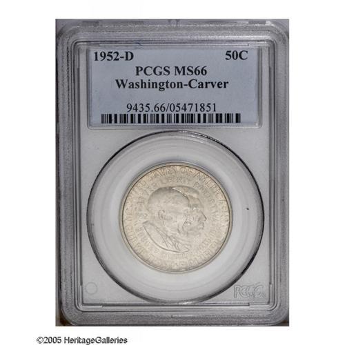 <B>1952-D<50C> Washington-Carver MS66 PCGS.</B></I> A faint coating of silver-gray patina has collected over each side of this premium Gem. Well struck, a few contact marks are visible on the map of America on the reverse. Only 8,006 pieces were struck. Population: 18 in 66, 0 finer (12/05).