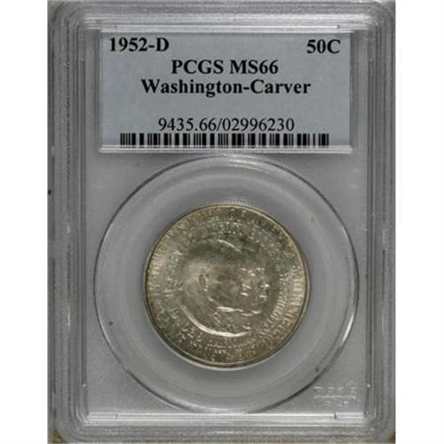 <B>1952-D 50C Washington-Carver MS66 PCGS.</B></I> Pastel steel-blue and chestnut toning graces this satiny and suitably struck Premium Gem. Marks are minimal, particularly on the obverse. Population: 26 in 66, 0 finer (3/08).<BR><BR><b>Shipping:</b> Coins & Currency (<a target="_blank" href="http://www.heritageauctions.com/common/shipping.php">view shipping information</a>)