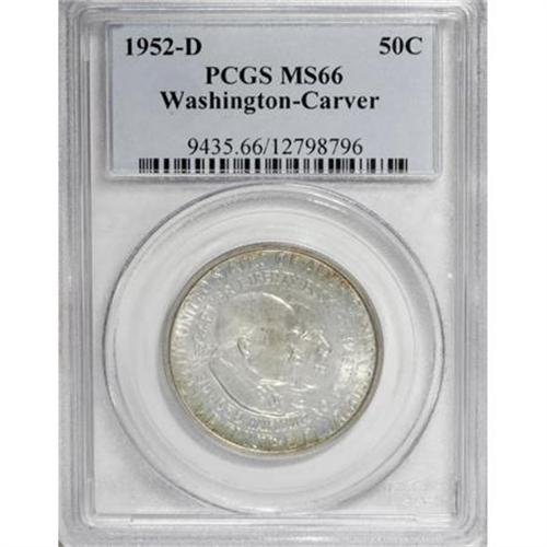 <B>1952-D 50C Washington-Carver MS66 PCGS.</B></I> Soft, hazy silver-gray toning dominates the centers, while elements of gold appear at the margins. Strongly lustrous beneath the patina and pleasingly preserved. Population: 26 in 66, 0 finer (2/08).<BR><BR><b>Shipping:</b> Coins & Currency (<a target="_blank" href="http://www.heritageauctions.com/common/shipping.php">view shipping information</a>)