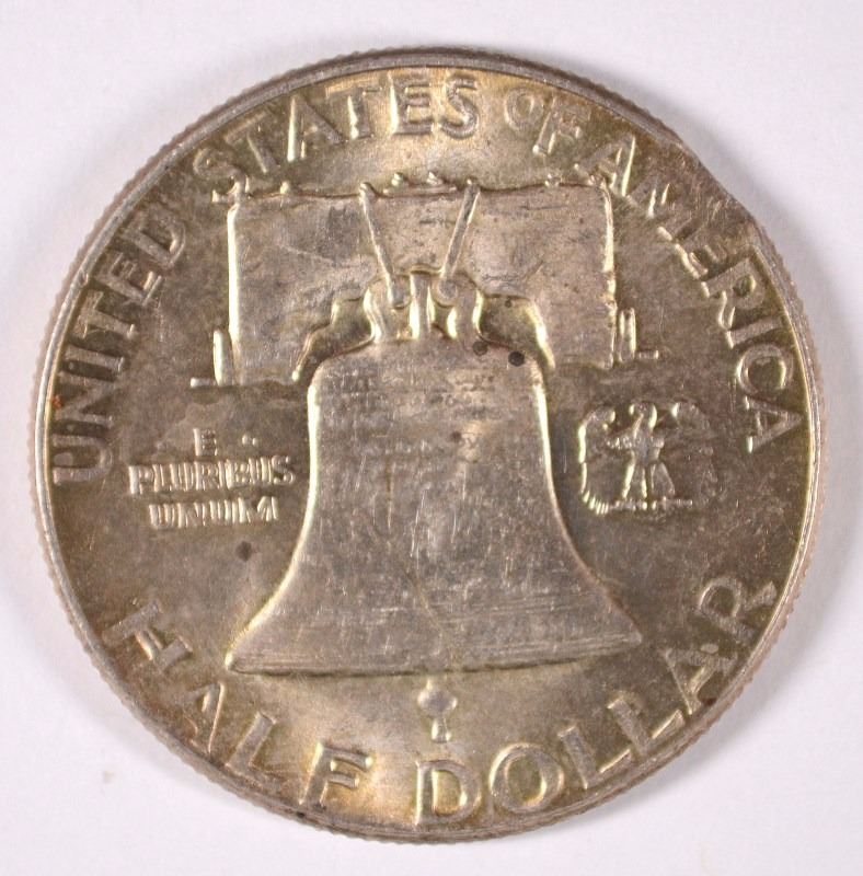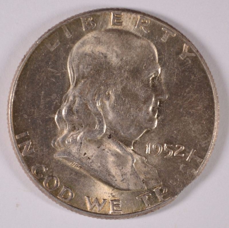 1952 FRANKLIN HALF DOLLAR, CHOICE BU MINT ERROR, CLIPPED PLANCHET IN "TRUST"