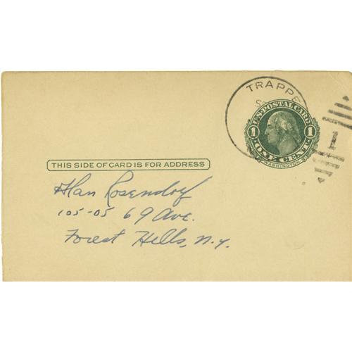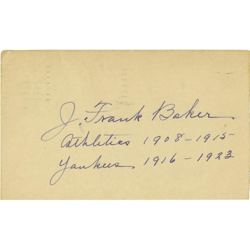 <B>1952 Frank "Home Run" Baker Signed Government Postcard.</B></I> The greatest slugger of the 1910's created a dream piece for the modern collector, a spectacularly rare "stat postcard" that lists his team affiliations of the course of his storied Hall of Fame career. Flawless 10/10 blue ink reads, "J. Frank Baker, Athletics 1908-1915, Yankees 1916-1923." Postcard is mailed from the town of Trappe, Maryland, where Baker began and ended his life. A magnificent specimen the likes of which you will never see again. <I>LOA from PSA/DNA. LOA from James Spence Authentication.</B></I><BR><BR><b>Shipping:</b> Sportscard (<a target="_blank" href="http://www.heritageauctions.com/common/shipping.php">view shipping information</a>)