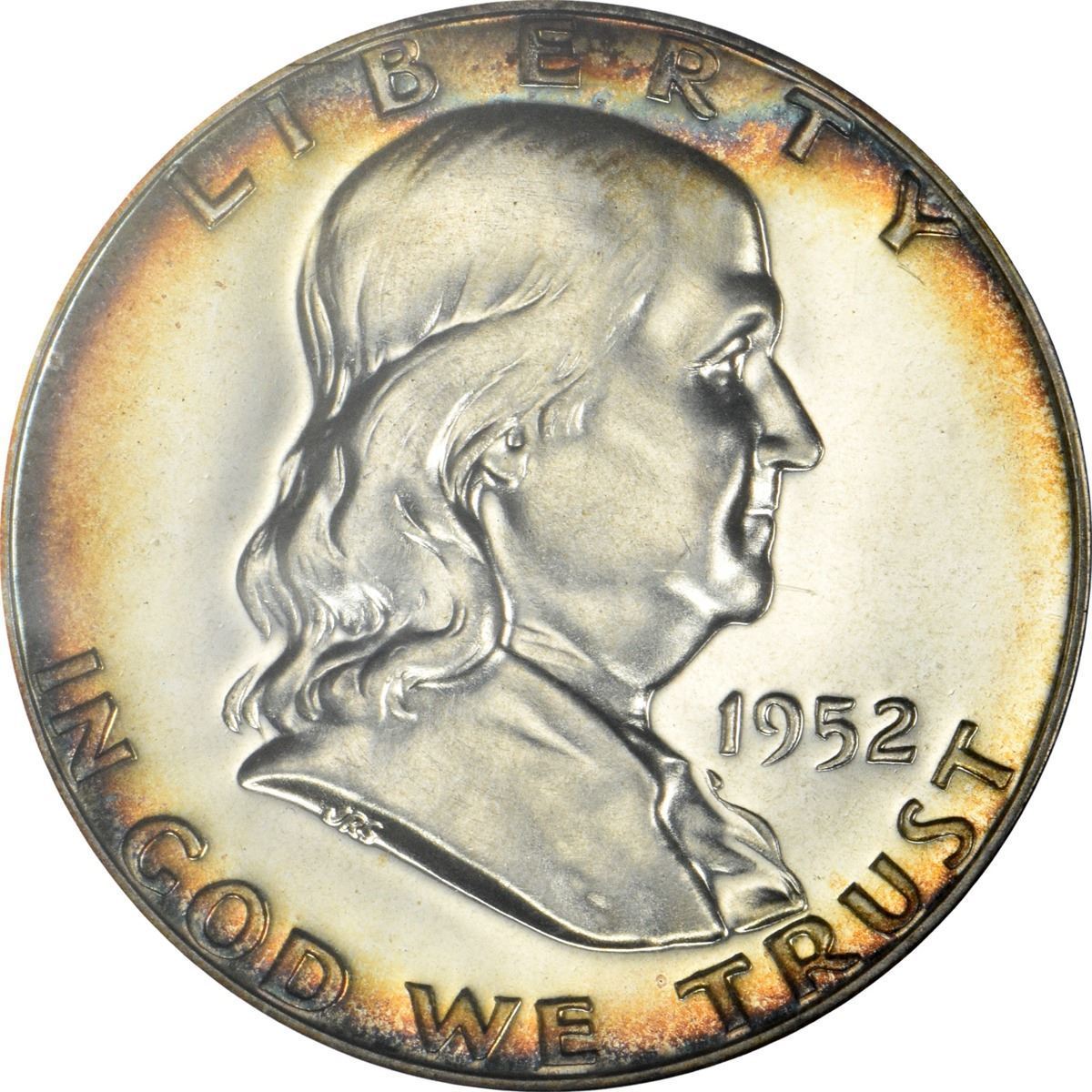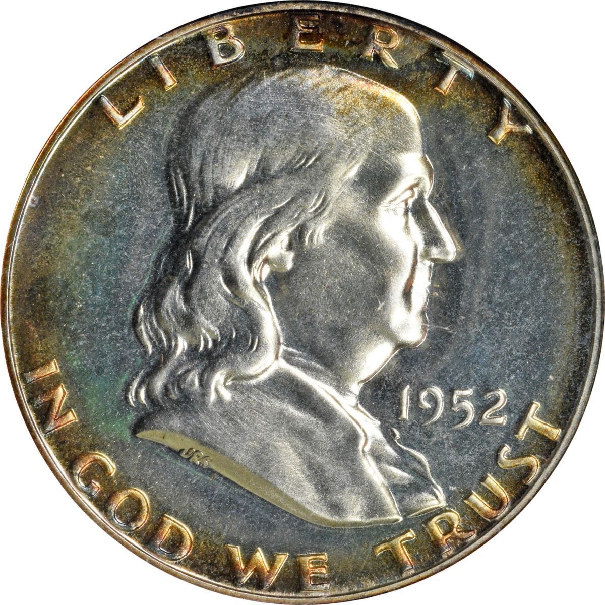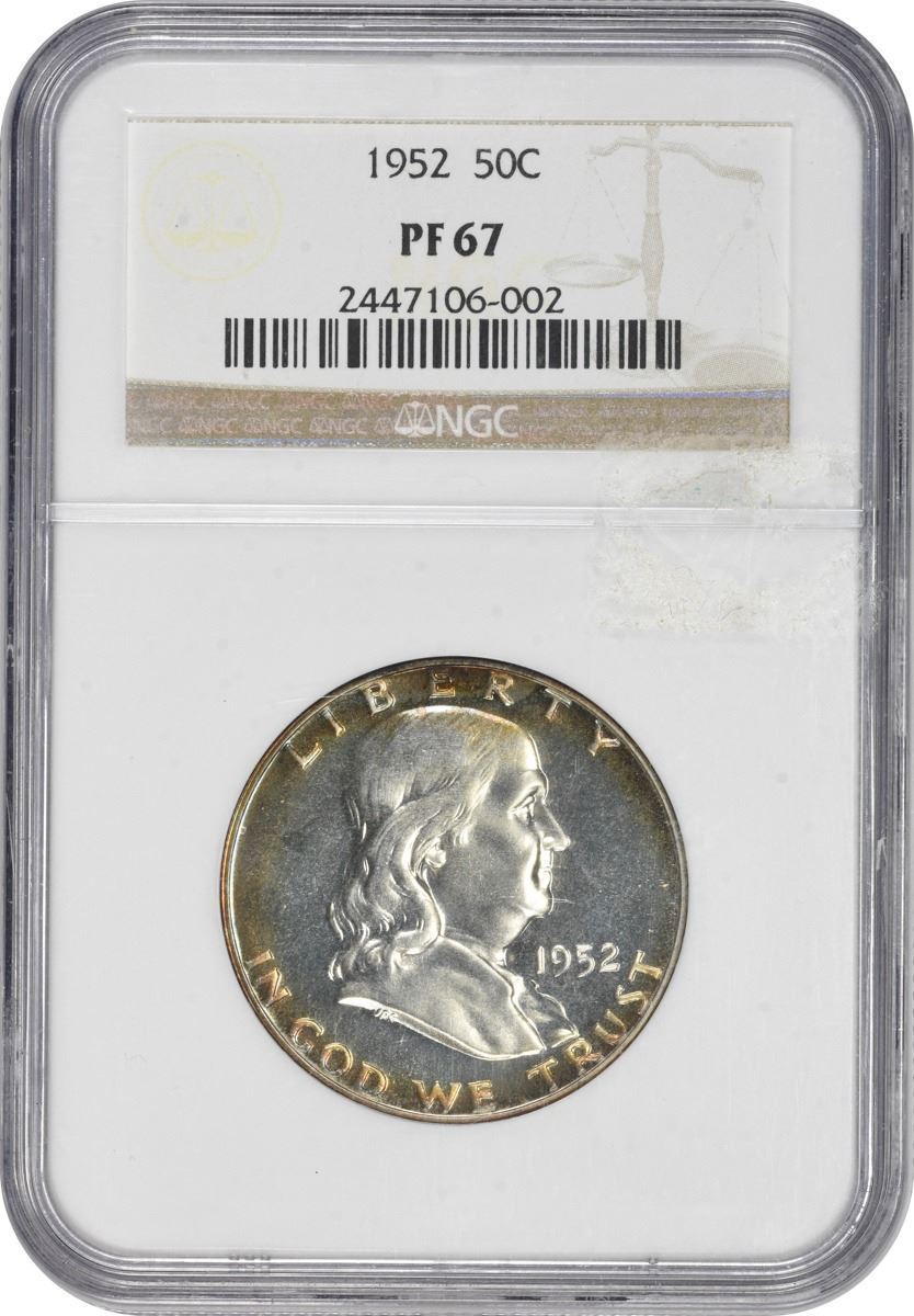 1952 Franklin 50¢. Proof-67 NGC. The lightly dusted motifs offer a faint cameo contrast with the mirror fields. Brilliant at the centers with deep rainbow iridescence gathered at the rims. One of 81,980 pieces struck.