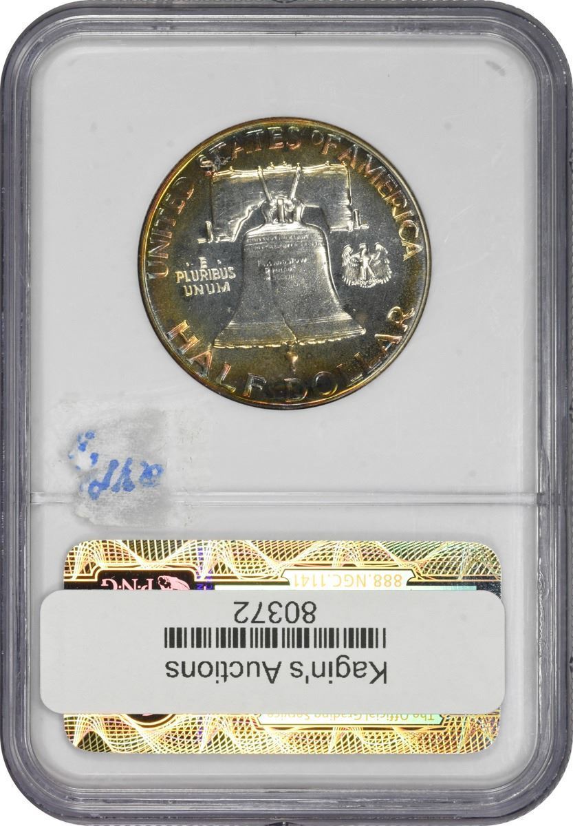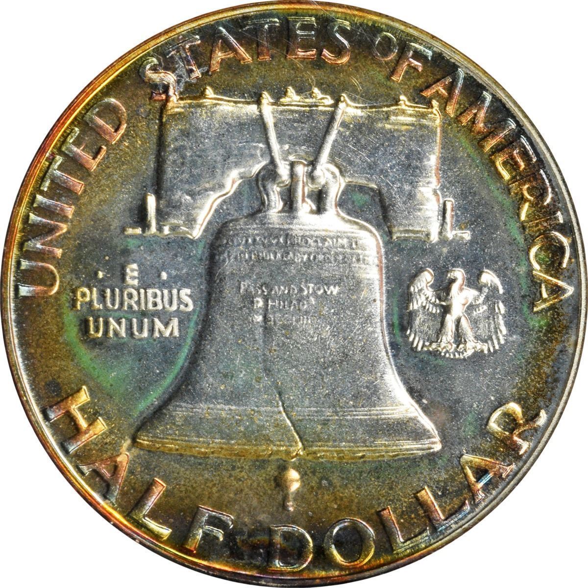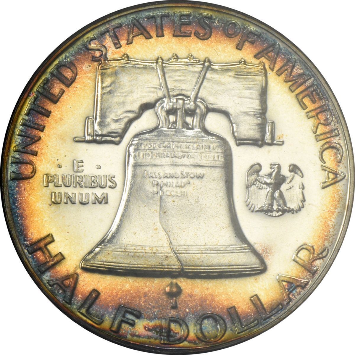 1952 Franklin 50¢. Proof-67 NGC. The lightly dusted motifs offer a faint cameo contrast with the mirror fields. Brilliant at the centers with deep rainbow iridescence gathered at the rims. One of 81,980 pieces struck.