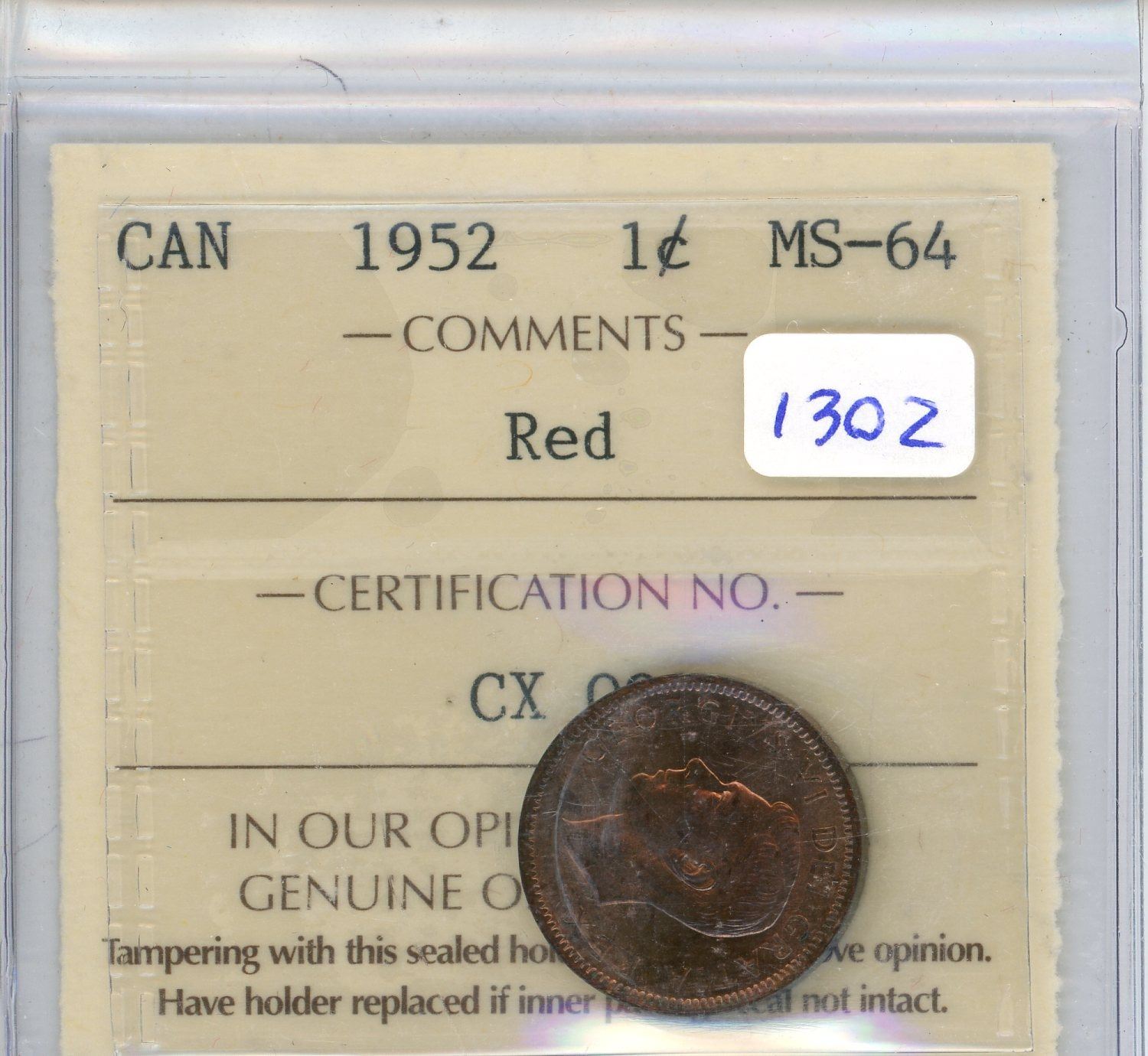 1952 ICCS graded Canadian one cent MS-64