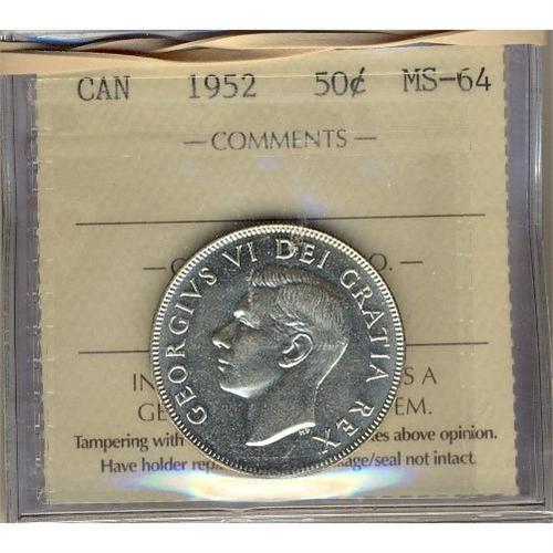 1952 MS64(2), 1955 MS63, 1964 Hvy Cam MS64 and 1982 SmBds Type 2 MS63 50¢. Lot of 4 coins all ICCS graded.