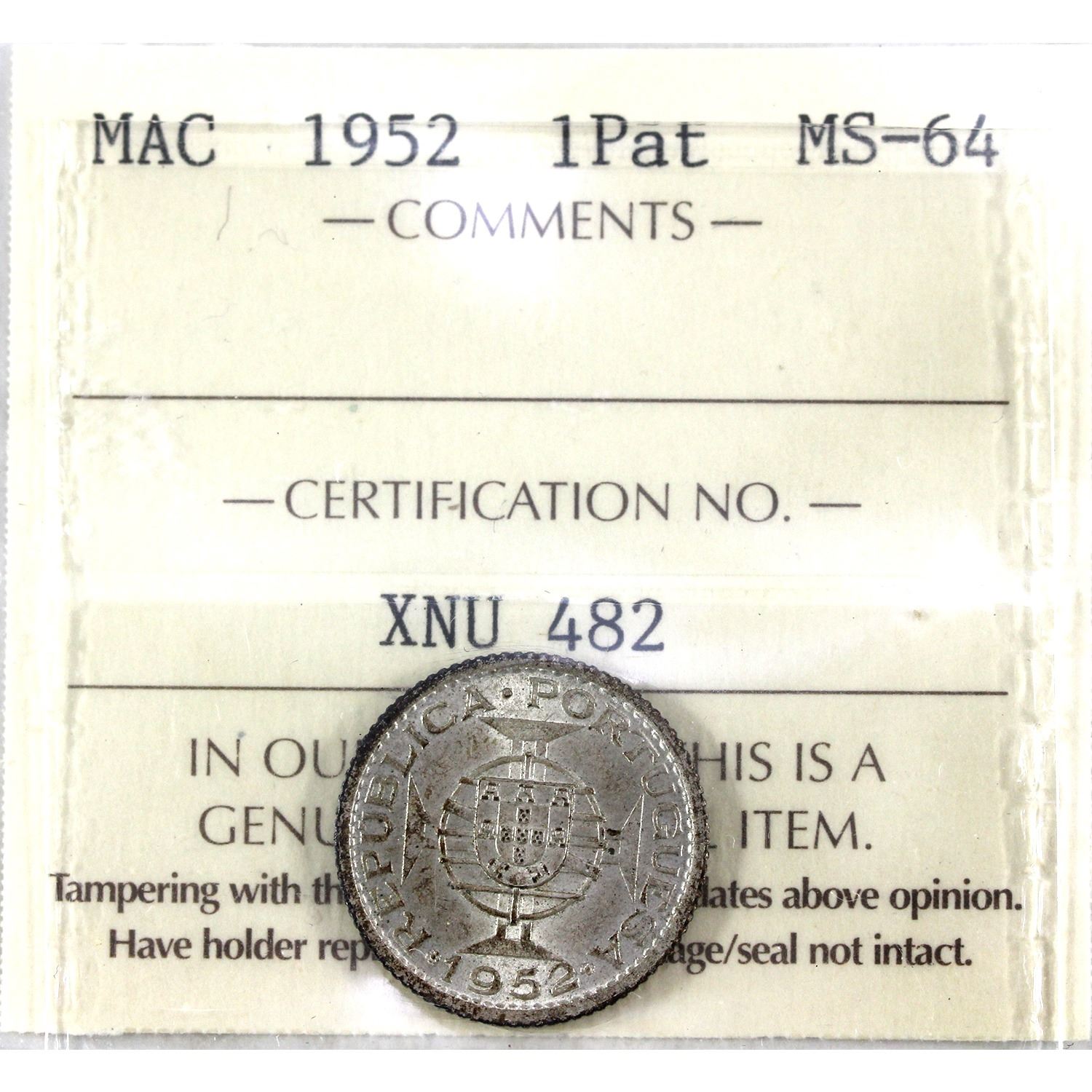 1952 Macau 1 Pataca ICCS Certified MS-64