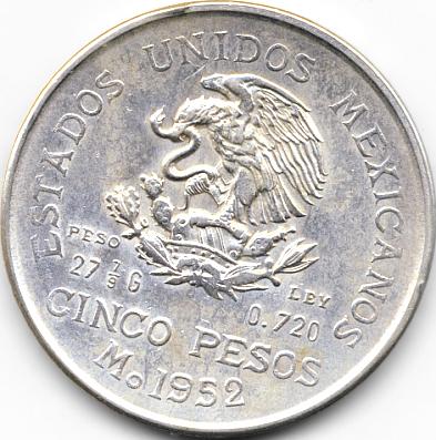 1952 Mo MEXICO SILVER CINCO PESOS-CH BU+