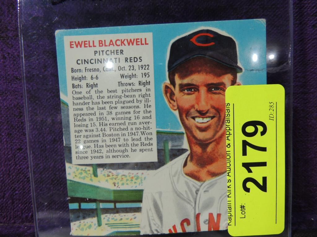 1952 RED MAN TOBACCO EWELL BLACKWELL 3N BASEBALL CARD. BASEBALL COLLECTIBLE. VINTAGE CARD. GOOD CONDITION. IN PLASTIC SLEEVE. AS SHOWN. SEE PHOTO FOR MORE DETAILS.