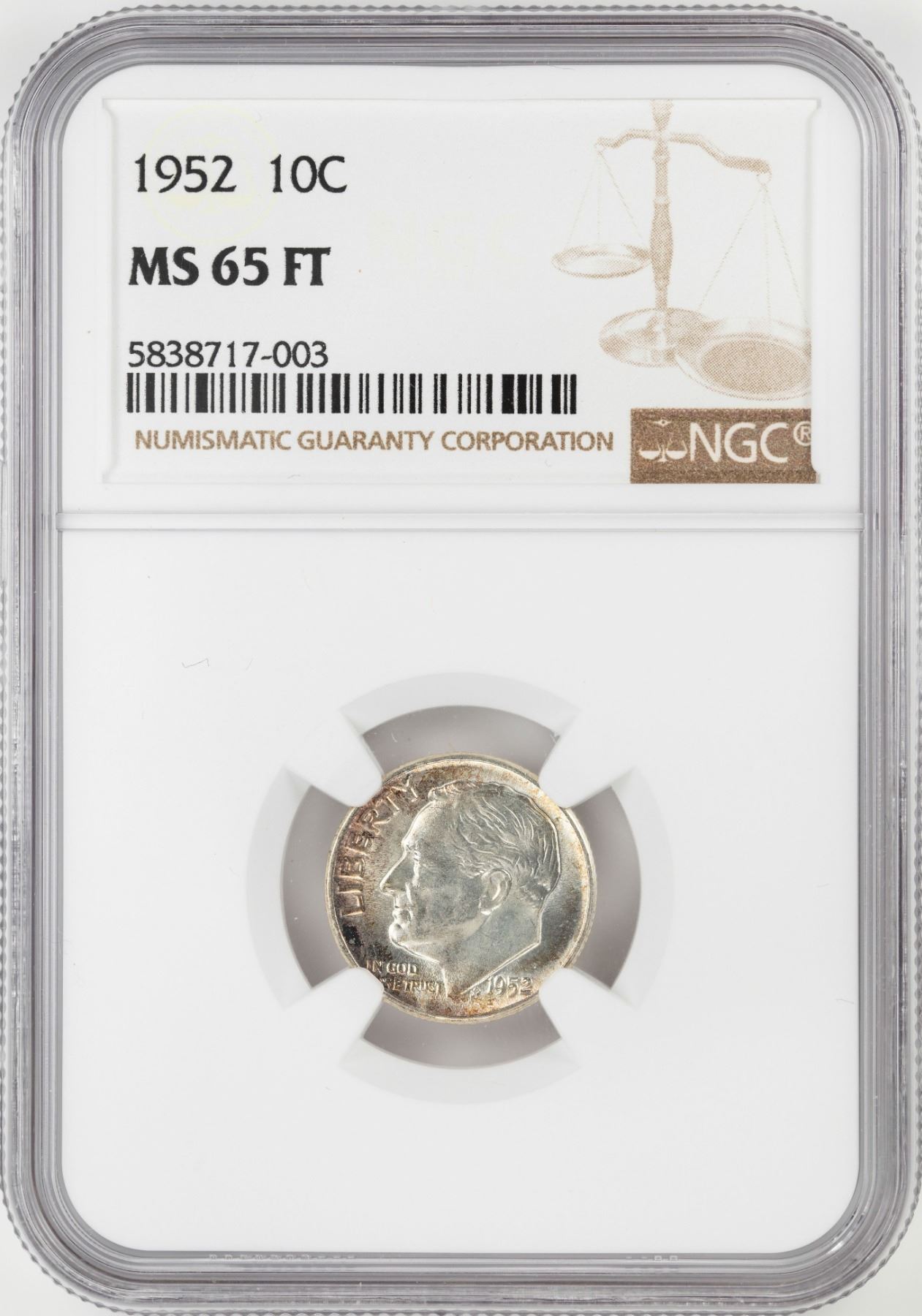 One 1952 Roosevelt Dime Coin NGC MS65FT.
