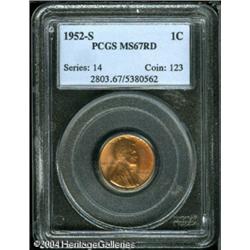 1952-S 1C MS67 Red PCGS. Well struck and impeccabl <B>1952-S 1C MS67 Red PCGS.</B></I> Well struck and impeccably preserved, with radiant luster, light-orange toning, and a large splash of red-orange and silver-gray patina in the upper right obverse field. A really beautiful Superb Gem. Population: 66 in 67, 0 finer (11/04).<BR><I>From The Dennis Dewart Collection.</B></I> <BR><BR><B>Important notice:</B> Heritage usually auctions material at the rate of 200-250 lots per hour. On some occasions eBay Live bid software or the Internet may not be able to keep up with the pace of the auction. We recommend placing a realistic absentee bid now as insurance to avoid disappointment. Occasionally the auctioneer may eliminate or reject an eBay Live bid, and the auctioneer may also reopen a lot after the close of the eBay live bidding (usually because we missed an audience bid), and may reject your bid even if it shows you as the winning bidder. By bidding via eBay Live, you agree that Heritage may award the lot to another bidder at its sole discretion under the circumstances described above or any other reasonable circumstances. Since eBay bids are not shown to us until we open the lot on the floor, we treat those bids just like floor bids. In most cases the floor responds before the eBay bid is presented to us, due to Internet lag time, so for consistency we have made it a policy that floor bids are always considered first over tie eBay live bids. Also please note that all Heritage lots purchased through eBay Live carry a 20% Buyer's Premium. Please make sure you read the Terms and Conditions before you bid. This lot is being auctioned in conjunction with a live floor auction by Heritage Galleries & Auctioneers. All final auction and invoice information will be supplied by Heritage Galleries & Auctioneers, and all other information should be considered preliminary. Lot:5191