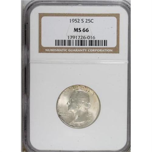 <B>1952-S 25C MS66 NGC.</B></I> NGC Census: (573/321). PCGS Population (625/122). Mintage: 13,707,800. Numismedia Wsl. Price for NGC/PCGS coin in MS66: $48. (#5851)<BR><BR><B>Coin Engraver:</B> John Flanagan<BR><BR><b>Shipping:</b> Coins & Currency (<a target="_blank" href="http://www.heritageauctions.com/common/shipping.php">view shipping information</a>)