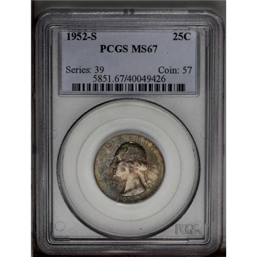 1952-S 25C MS67 PCGS. Mottled deep blue and crimson to 1952-S[25C] MS67 PCGS.