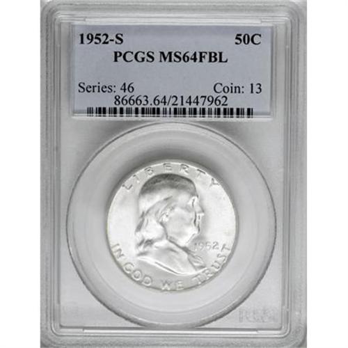 <B>1952-S 50C MS64 Full Bell Lines PCGS.</B></I> PCGS Population (296/226). NGC Census: (25/14). Numismedia Wsl. Price for NGC/PCGS coin in MS64: $260. (#86663)<BR><BR><b>Shipping:</b> Coins & Currency (<a target="_blank" href="http://www.heritageauctions.com/common/shipping.php">view shipping information</a>)