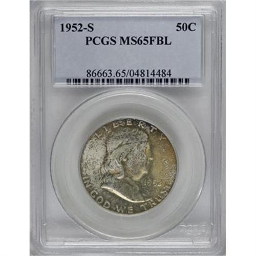 <B>1952-S 50C MS65 Full Bell Lines PCGS.</B></I> Variegated swirls of olive and amber-gold toning adorn the obverse, while the reverse shows a small degree of speckled russet and gold patina. Boldly struck and highly lustrous. <BR><BR><b>Shipping:</b> Coins & Currency (<a target="_blank" href="http://www.heritageauctions.com/common/shipping.php">view shipping information</a>)