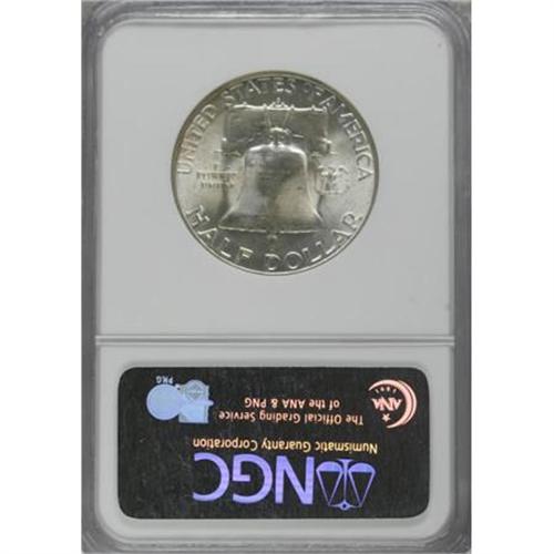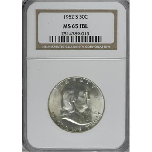 <B>1952-S 50C MS65 Full Bell Lines NGC.</B></I> An unusually intense layer of gleaming mint frost covers both sides of this well struck specimen. The surfaces display an appealing mixture of bluish-silver and pastel peach coloration. A few wispy marks prevent an even finer grade assessment. A great Gem example of this Franklin half dollar key date. Census: 13 in 65 Full Bell Lines, 1 finer (10/07). <BR><BR><b>Shipping:</b> Coins & Currency (<a target="_blank" href="http://www.heritageauctions.com/common/shipping.php">view shipping information</a>)