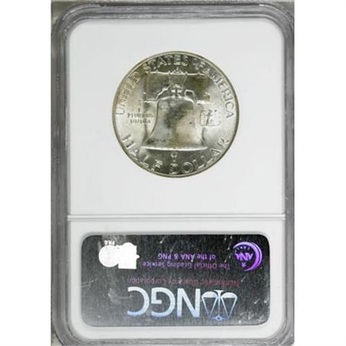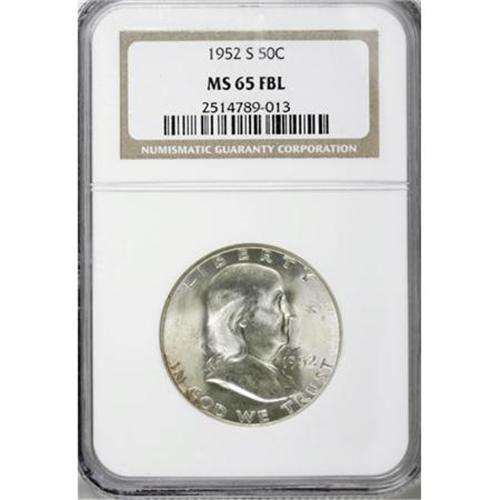 <B>1952-S 50C MS65 Full Bell Lines NGC.</B></I> An unusually intense layer of gleaming mint frost covers both sides of this well struck specimen. The surfaces display an appealing mixture of bluish-silver and pastel peach coloration. A few wispy marks prevent an even finer grade assessment. A great Gem example of this Franklin half dollar key date. Census: 13 in 65 Full Bell Lines, 1 finer (12/07). <BR><BR><b>Shipping:</b> Coins & Currency (<a target="_blank" href="http://www.heritageauctions.com/common/shipping.php">view shipping information</a>)
