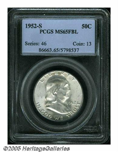 <B>1952-S<50C> MS65 Full Bell Lines PCGS.</B></I> Lustrous surfaces are virtually white. A couple of minor marks are noted on Franklin's portrait.