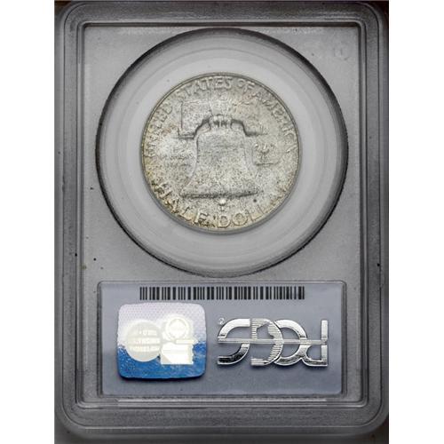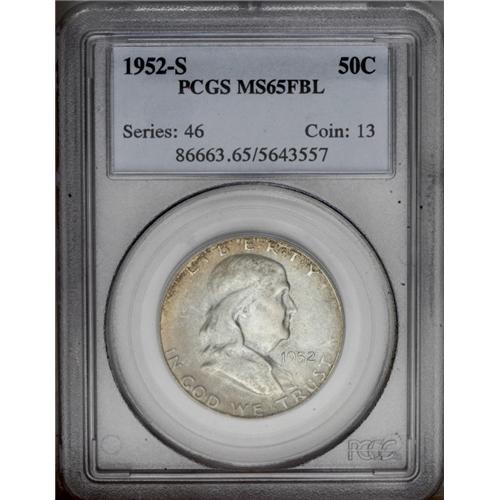 <B>1952-S<50C> MS65 Full Bell Lines PCGS.</B></I> The lustrous green-gray surfaces have a slight degree of reddish-tan peripheral toning on the obverse and a light coating of speckled russet patina on the reverse. Carefully preserved and nearly mark-free. The '52-S is a slightly scarcer Franklin half at the MS65 Full Bell Lines grade level, and it is a definite rarity any finer. Population: 187 in 65, 22 finer (2/06).