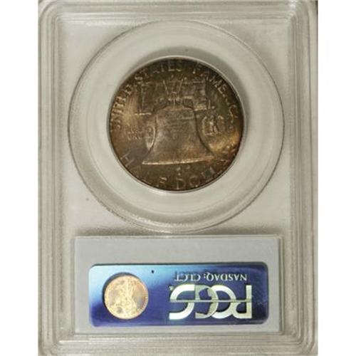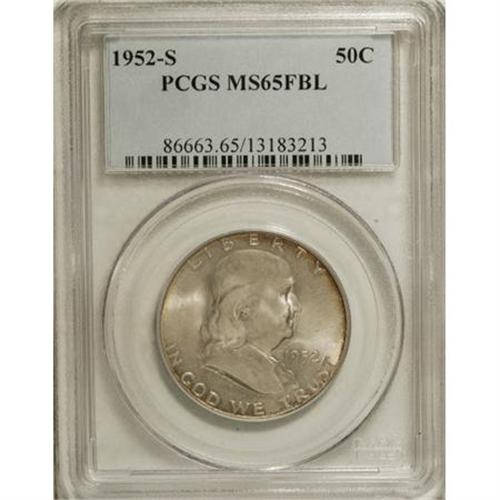 <B>1952-S 50C MS65 Full Bell Lines PCGS.</B></I> A pleasing S-mint piece with noteworthy detail overall, particularly on the all-important bell. The satiny obverse displays largely silver-gray color with traces of rose-gold at the margins, while the reverse has rich russet patina with a small area of dappled cloud-gray in the center. PCGS has graded only 25 finer Full Bell Lines pieces (4/07).<BR><BR><b>Shipping:</b> Coins & Currency (<a target="_blank" href="http://www.heritageauctions.com/common/shipping.php">view shipping information</a>)
