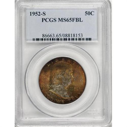 <B>1952-S 50C MS65 Full Bell Lines PCGS.</B></I> Solidly struck for this issue and quite lustrous with mottled bronze and lavender patina on the obverse. The toning is restricted to the periphery on the reverse, and some abrasions are noted on the bell.<BR><BR><b>Shipping:</b> Coins & Currency (<a target="_blank" href="http://www.heritageauctions.com/common/shipping.php">view shipping information</a>)