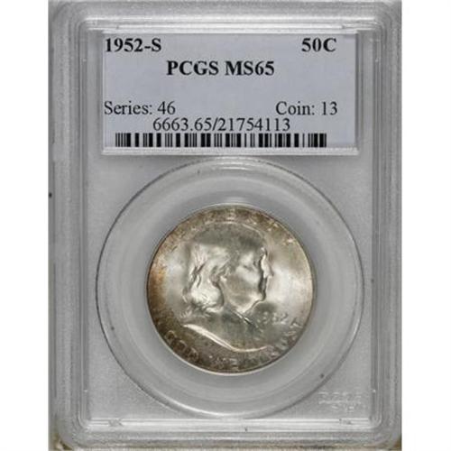 <B>1952-S 50C MS65 PCGS.</B></I> PCGS Population (1044/166). NGC Census: (761/240). Mintage: 5,526,000. Numismedia Wsl. Price for NGC/PCGS coin in MS65: $80. (#6663)<BR><BR><B>Coin Engraver:</B> John R. Sinnock<BR><BR><b>Shipping:</b> Coins & Currency (<a target="_blank" href="http://www.heritageauctions.com/common/shipping.php">view shipping information</a>)