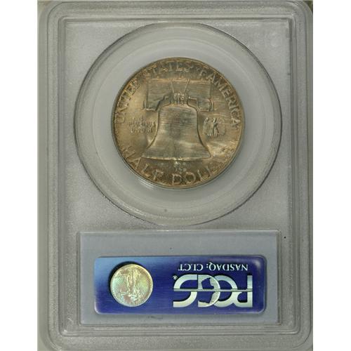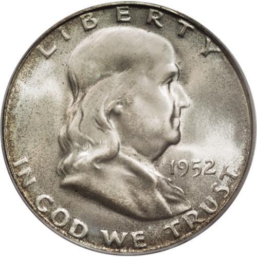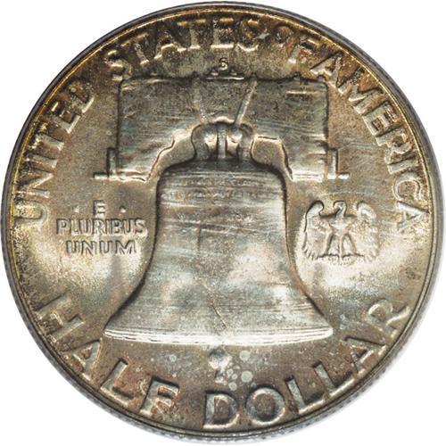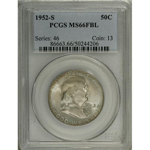 <B>1952-S 50C MS66 Full Bell Lines PCGS.</B></I> Beautiful powder-blue and chestnut toning enriches the obverse. Somewhat deeper orange and olive-gray patina embraces the reverse. Both sides display vibrant cartwheel sheen, and the preservation is exceptional. Scarce with Full Bell Lines. Population: 24 in 66, 0 finer (11/06).<BR><BR><b>Shipping:</b> Coin/Currency (<a target="_blank" href="http://www.heritageauctions.com/common/shipping.php">view shipping information</a>)