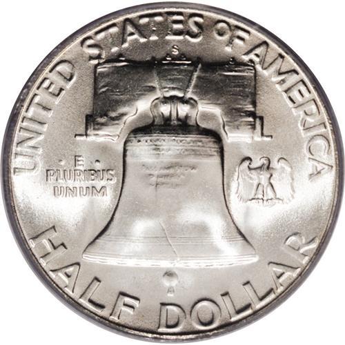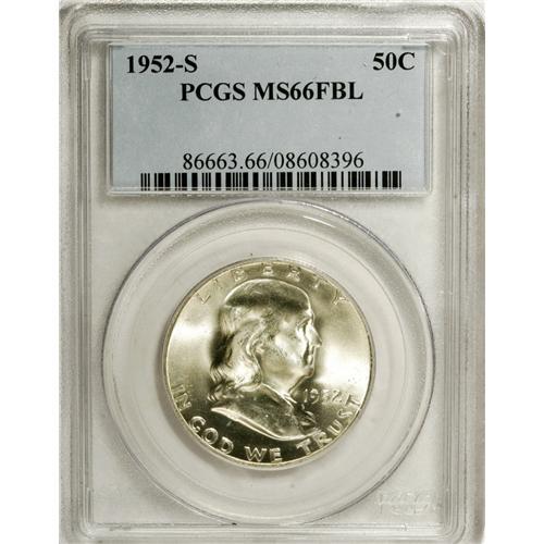<B>1952-S 50C MS66 Full Bell Lines PCGS.</B></I> Relentlessly brilliant on both sides, for those who like their Full Bell Lines Franklins untoned. Deep mint frost evenly covers each side, with a near-total lack of mentionable distractions even under a loupe. Population: 24 in 66 Full Bell Lines, 0 finer (12/06).<BR><BR><b>Shipping:</b> Coin/Currency (<a target="_blank" href="http://www.heritageauctions.com/common/shipping.php">view shipping information</a>)