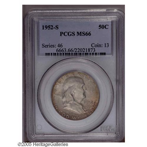 1952-S 50C MS66 PCGS. Honey-brown color clings to the 1952-S[50C] MS66 PCGS.
