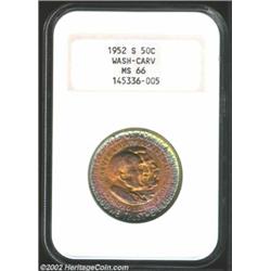 1952-S 50C Washington-Carver MS66 NGC. Both sides are outrageously toned with iridescent bands of copper-gold, champagne-rose, and electric-blue patina. Sharply struck and lustrous with immaculate surfaces. None have been graded higher by NGC.Ex: Chicago Sale (Superior, 8/1991), lot 118. Important notice: We expect to be auctioning lots at the rate of 200-250 per hour. Sometimes eBay Premier live bid software cannot keep up with that pace, so we strongly recommend that you place a realistic proxy bid now as insurance to avoid disappointment. Also please note that all Heritage/CAA lots purchased through eBay Premier carry a 20% Buyer's Premium. Please make sure you read the Terms and Conditions.