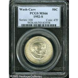 <B>1952-S 50C Washington-Carver MS66 PCGS.</B></I> Remarkably bold for this often poorly detailed issue, even being fully rounded on Carver's cheekbone. Both obverse and reverse display silver-white toning, with bits of soft lemon-yellow color that is most evident around the obverse border. Minimally abraded, as expected for a premium Gem. Population: 40 in 66, 2 finer (1/05). Lot:8626
