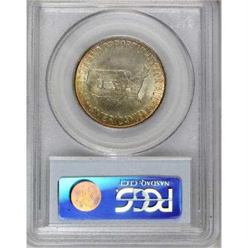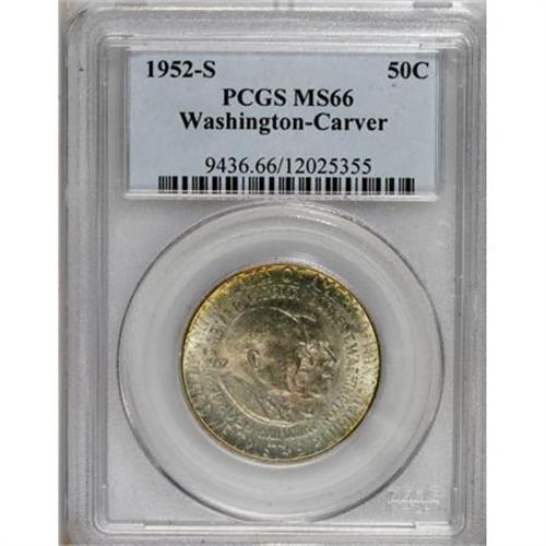 <B>1952-S 50C Washington-Carver MS66 PCGS.</B></I> Green-gold peripheral toning changes to rose and turquoise in the centers. This frosty and well struck Washington-Carver commemorative has an unusually pleasing appearance. PCGS has graded just two finer examples (10/07). <BR><BR><b>Shipping:</b> Coins & Currency (<a target="_blank" href="http://www.heritageauctions.com/common/shipping.php">view shipping information</a>)