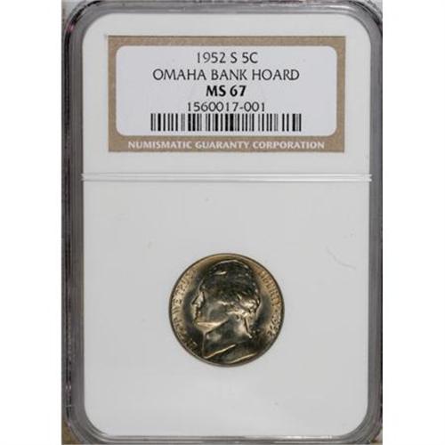 <B>1952-S 5C MS67 NGC.</B></I> Ex: Omaha Bank Hoard. NGC Census: (30/0). PCGS Population (0/0). Mintage: 20,572,000. Numismedia Wsl. Price for NGC/PCGS coin in MS67: $110. (#4048)<BR><BR><b>Shipping:</b> Coins & Currency (<a target="_blank" href="http://www.heritageauctions.com/common/shipping.php">view shipping information</a>)