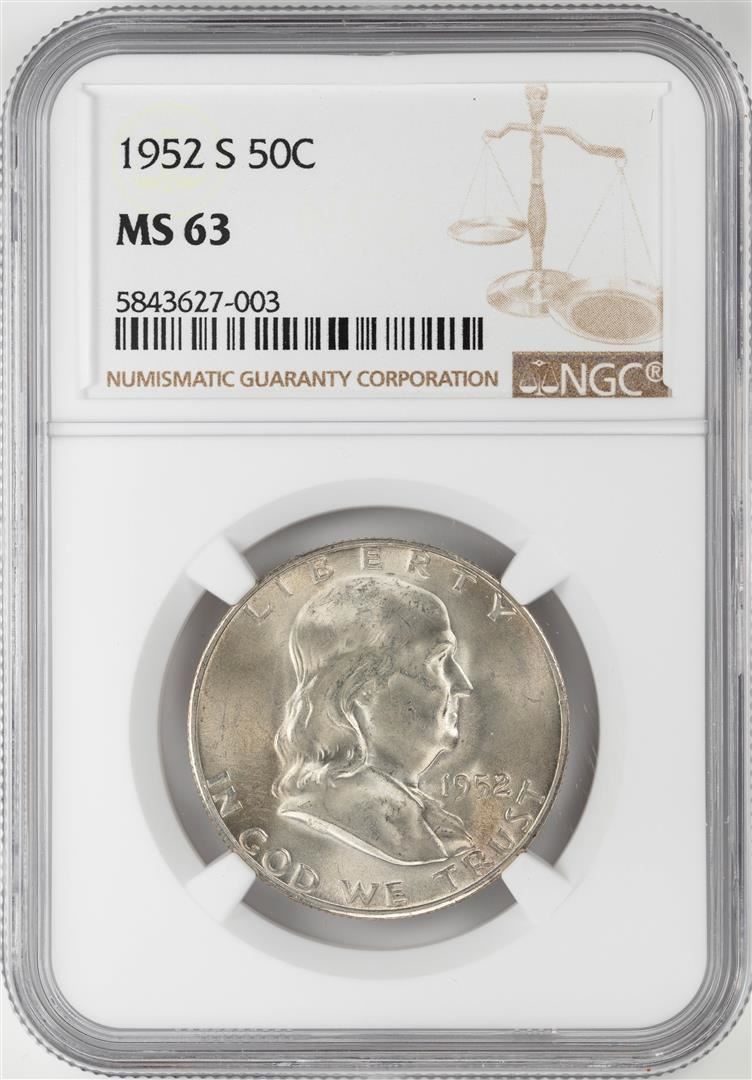 One 1952-S Franklin Half Dollar Coin NGC MS63. NGC Certified.