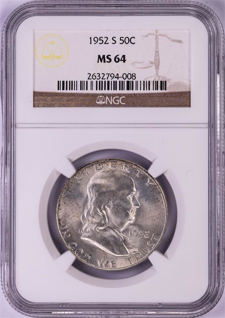 One 1952-S Franklin Half Dollar Coin NGC MS64. NGC Certified.